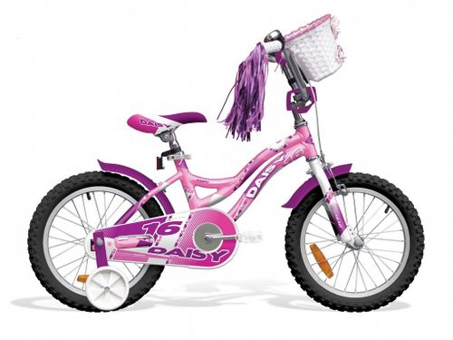 Rower dziecięcy na kołach 16”. Kształt ramy z obniżoną górną rurką ułatwia wsiadanie i zsiadanie. Wygodne i trwałe siodełko. Wygodne chwyty kierownicy. Hamulec w tylnej pieście umożliwi dziecku instynktowne, pewne hamowanie. Wytrzymałe kółka boczne ułatwiają naukę jazdy na rowerze. Szerokie opony zapewniają stabilność w czasie jazdy. Światła odblaskowe, błotniki i dzwonek.