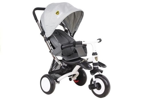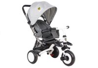 Prezentowany rower trójkołowy swą konstrukcją przypomina wózek typu spacerówka — świadczy o tym rozkładany daszek z siatką czy w pełni regulowane oparcie pozwalające na ustawienie pozycji półleżącej, dzięki czemu potowarzyszy on Twojemu maluszkowi od pierwszych lat życia aż do czasu, gdy będzie mógł samodzielnie jeździć na dwukołowym rowerku. Srebrno-czarny pojazd dla maluchów oparty jest na trzech piankowych kołach, które posiadają wiele zalet — są odporne na przebicia, a ich waga jest dużo niższa, niż w przypadku opon pompowanych.