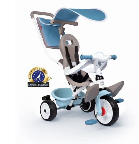 Rowerek Baby Balade niebieski z regulowaną rączką, blokadą kierownicy, hamulcem postojowym, pasami i pierścieniem bezpieczeństwa, komfortowym i ergonomicznym siedziskiem z podwyższonym zagłówkiem, blokadą wolnego koła, schowkiem na drobiazgi i torbą oraz daszkiem przeciwsłonecznym. Ciche koła.