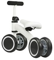 Biały, czterokołowy rowerek z tworzywa sztucznego przeznaczony dla dzieci pomiędzy 1, a 3 rokiem życia. Wykonany z bardzo lekkich materiałów.