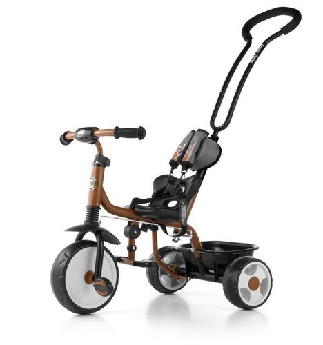 Solidny i bezpieczny rowerek o nowoczesnej stylistyce. Wygodne siedzisko oraz miękkie oparcie zapewniają maksymalny komfort jazdy. Pięciopunktowe pasy utrzymują stabilność dziecka w siedzisku. Rowerek posiada prosty mechanizm działający na zasadzie sprzęgła. Po odłączeniu napędu pedałki mogą obracać się niezależne od ruchu przedniego koła, co przydatne jest podczas prowadzenia rowerka przez rodzica (ruch pedałków nie jest wymuszany przez ruch koła!). Rama łączona , co umożliwia złożenie rowerka np. na wyjazd.