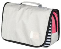 Specyfikacja: - główna komora na suwak z wieloma organizerami, - zapinana na zamek kieszeń z siatki, - zdejmowane lusterko, - torbę można rozłożyć i zawiesić za haczyk, - ucho ułatwiające przenoszenie, - tylny pasek do zawieszenia na uchwyt walizki, - pojemność: 4 l, - 100% polyester, - 23h x 32w x 10d cm.