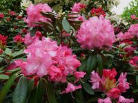 Zimozielony krzew o pokroju o płaskokulistym, osiągający w wieku 10 lat około 1,1 m wysokości oraz 1,4 m szerokości. Pędy gęsto ułożone, liście podłużne, ciemnozielone. Kwiaty duże (6-8 cm), w pąku ciemnoróżowe, po rozkwitnięciu różowo-czerwone, delikatnie białe wewnątrz, różowe na brzegach, zebrane w duże, kuliste kwiatostany na szczytach pędów. Pojawiają się bardzo obficie i utrzymują się długo na krzewie, od maja do czerwca.