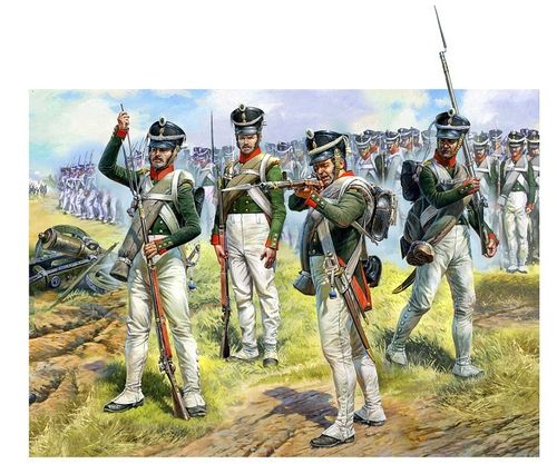 Russian Line Infantry Napoleonic Wars. Zestaw zawiera 6 figurek w 4 pozach, montaż nie wymaga użycia kleju, całkowicie nowe formy.