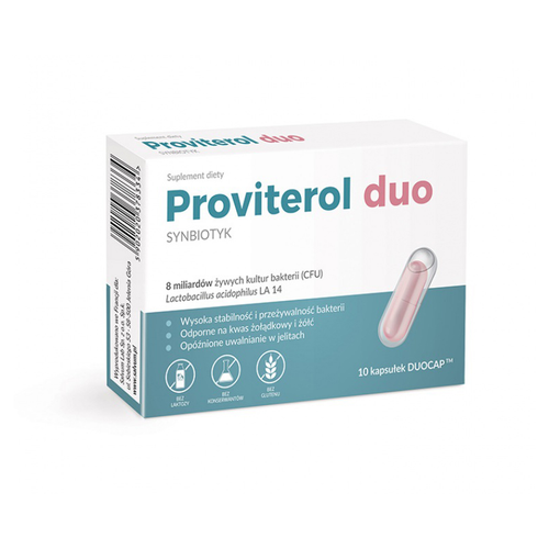Proviterol Duo - niezwykły synbiotyk, stworzony za pomocą synergicznego połączenia bakterii kwasu mlekowego (Lactobacillus acidophilus LA 14) i fruktooligosacharydów. Aby zapewnić stabilność i znacznie dłuższą żywotność bakterii firma Salvum zastosowała doskonałe rozwiązanie, opatentowaną technologię DUOCAP TM, która polega na umiejscowieniu mniejszej kapsułki, o bardzo niskiej zawartości wody, z kulturami bakterii w większej zawierającej glicerol. Pozwala to w bezpieczny sposób rozlokować się bakteriom w jelitach, bez uszczerbku wynikającego choćby z działanie kwasu żołądkowego. Produkt zaleca się w szczególności osobom, które przebyły antybiotykoteriapię aby w szybki sposób przywrócić optymalną mikroflorę organizmu.