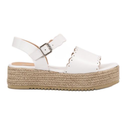 Urocze, eleganckie buty w kolorze białym wykonane ze skóry ekologicznej. Szeroki pasek podtrzymujący palce gwarantuje komfort, a wygodna sprzączka idealne dopasowanie buta do stopy. Wysoka platforma ozdobiona jest trzema paskami ze sznurka jutowego nadającego sandałom wyjątkowego charakteru. Bieżnik sprawia, że buty są stabilne nawet na dosyć śliskich powierzchniach.