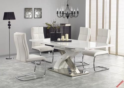 Opis produktu Sprawdzony i popularny na rynku, tym razemw nowej odsłonie – z praktycznym szklanym blatem.Elegancka prosta forma stołu zaakcentowanajest odważnie zaprojektowaną podstawą ze stalinierdzewnej. Sprawdzi się w wielu nowoczesnycharanżacjach. Stół rozkładany wymiary: 160÷220/90/75 cm materiał: szkło / MDF lakierowany / stal nierdzewna kolor: szkło – ekstra biały, MDF – biały