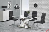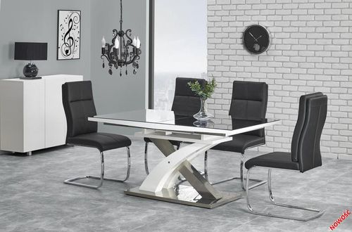 Opis produktu Sprawdzony i popularny na rynku, tym razemw nowej odsłonie – z praktycznym szklanym blatem.Elegancka prosta forma stołu zaakcentowanajest odważnie zaprojektowaną podstawą ze stalinierdzewnej. Sprawdzi się w wielu nowoczesnycharanżacjach. Stół rozkładany, wymiary: 160÷220/90/75 cm materiał: szkło / MDF lakierowany / stal nierdzewna kolor: szkło – czarny, MDF – biały