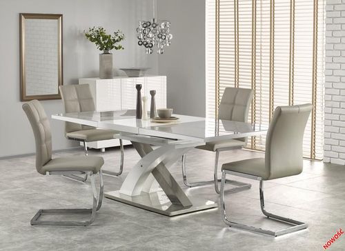 Opis produktu Sprawdzony i popularny na rynku, tym razemw nowej odsłonie – z praktycznym szklanym blatem.Elegancka prosta forma stołu zaakcentowanajest odważnie zaprojektowaną podstawą ze stalinierdzewnej. Sprawdzi się w wielu nowoczesnycharanżacjach. Stół rozkładany, wymiary: 160÷220/90/75 cm materiał: szkło / MDF lakierowany / stal nierdzewna kolor: szkło – popiel, MDF – biały