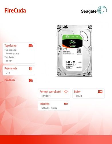 EAN: 3660619400379 Gwarancja: 60 miesięcy Kod dostawcy: ST2000DX002 Model: FireCuda Typ dysku: SSHD Format szerokości: 3,5'' (LFF) Typ napędu: Wewnętrzny Pojemność dysku: 2 TB Interfejs dysku: SATA III - 6 Gb/s Bufor: 64 MB Wysokość: 26.11 mm Szerokość: 101.6 mm Głębokość: 146.99 mm Waga: 535 g