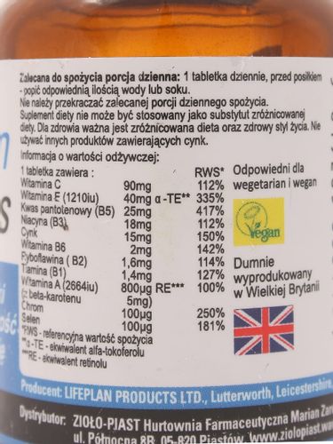 Preparat stanowi niezwykły kompleks składników dobroczynnie oddziałujących na pracę organizmu. Skutecznie chroni go przed działaniem czynników zewnętrznych. Zawiera dobrze przyswajalną postać selenu oraz witamin i składników mineralnych. Dzięki temu przeciwdziała przedwczesnemu starzeniu się i działa antyoksydacyjnie (neutralizując właściwości wolnych rodników). Zapobiega niszczącemu utlenianiu hemoglobiny. Stymuluje syntezę przeciwdziała i chroni przed degradacją błon komórkowych. Opóźnia tworzenie się zmian o charakterze miażdżycowym. Pobudza odpowiedź limfocytów na pojawienie się czynników chorobotwórczych. | | | | | | Składniki: | |  | | 1 tabletka zawiera: witamina A 800mcg, witamina E 34mg, witamina C 90mg, witamina B1 1.4mg, witamina B2 1.6mg, witamina B6 2mg, niacyna 18mg, kwas pantotenowy 25mg, cynk 15mg, selen 100mcg, chrom 100mcg