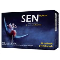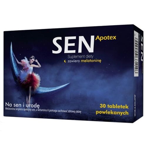 Spokojny sen pozwala na właściwą regenerację organizmu. Wpływa na urodę i dobre samopoczucie oraz zmniejsza skutki stresu. Sen Apotex to suplement diety, który zawiera melatoninę, wyciąg z szyszek chmielu, melisę, magnez, witaminę B6, witaminę D i witaminę A. Melatonina pomaga w skróceniu czasu potrzebnego do zaśnięcia (korzystne działanie występuje w przypadku spożycia 1mg melatoniny krótko przed pójściem spać) oraz zmniejsza subiektywne odczucia związane ze zmianą strefy czasowej (korzystne działanie występuje w przypadku spożywania 0,5mg krótko przed pójściem spać pierwszego dnia podróży i przez kolejne kilka dni po przybyciu do celu podróży). Chmiel wpływa kojąco na układ nerwowy, posiada właściwości odprężające i relaksujące. Melisa lekarska przyczynia się do zmniejszenia niepokoju i drażliwości. Magnez i witamina B6 zmniejszają uczucie zmęczenia i znużenia, pomagają w prawidłowym funkcjonowaniu układu nerwowego. Magnez i witamina D ułatwiają utrzymanie zdrowych zębów. Witamina A pomaga zachować zdrową skórę. Witamina E wspomaga ochronę komórek przed stresem oksydacyjnym.