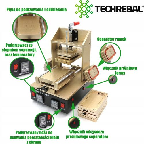 Separator do podgrzewania ekranów i wyświetlacza, które są złączone klejem OCA/LOCA - (najczęściej wystarcza temperatura 80-100°C) kolejnym krokiem jest użycie drutu molibdenowego, za pomocą którego należy rozciąć dwa sklejone ze sobą elementy. Kolejnym etapem do naprawy wyświetlacza, jest przyklejenie nowego dotyku (digitizer'a) za pomocą kleju UV LOCA. Model ten jest bardzo precyzyjnym urządzeniem, który utrzymuje temperaturę zadaną. Górna część grzewcza wykonana jest z grubej i precyzyjnie wykonanej płyty. Dzięki temu temperatura rozprowadza się równomiernie na jej powierzchni. Jedną zalet tego podgrzewacza, jest brak konieczności użycia docisków, ponieważ wytwarza on podciśnienie, które odpowiednio dociąga ekran razem z silikonową podkładką do podgrzewacza. Takie rozwiązanie pozwala na separację jeszcze cieńszych klejonych fabrycznie warstw ekranów LCD. Silikonowa podkładka uszczelnia przestrzeń pomiędzy płytą grzewczą a stłuczonym ekranem LCD. Separator posiada bardzo wydajną pompę podciśnienia, skutecznie dociągającą stłuczony ekran bez możliwości przemieszczenia w czasie procesu separacji.