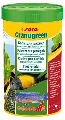 sera Granugreen to pokarm podstawowy w postaci starannie wyprodukowanego granulatu dla mniejszych pielęgnic żywiących się głównie peryfitonem. Do tej grupy zaliczają się wschodnioafrykańskie gatunki pielęgnic. Doskonałej jakości składniki roślinne, takie jak spirulina i szpinak, z wysoką zawartością naturalnych karotenoidów wspierają rozwój ubarwienia. Zbilansowana kompozycja wspiera zdrowy rozwój i trawienie. Wolno tonący granulat zachowuje swój kształt i nie zanieczyszcza wody.