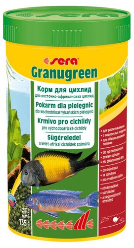 sera Granugreen to pokarm podstawowy w postaci starannie wyprodukowanego granulatu dla mniejszych pielęgnic żywiących się głównie peryfitonem. Do tej grupy zaliczają się wschodnioafrykańskie gatunki pielęgnic. Doskonałej jakości składniki roślinne, takie jak spirulina i szpinak, z wysoką zawartością naturalnych karotenoidów wspierają rozwój ubarwienia. Zbilansowana kompozycja wspiera zdrowy rozwój i trawienie. Wolno tonący granulat zachowuje swój kształt i nie zanieczyszcza wody.