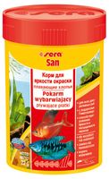 sera San to odżywczy pokarm wybarwiający w postaci starannie wyprodukowanych płatków dla wszystkich ryb żerujących przy powierzchni. Wysokiej jakości składniki, takie jak algi Haematococcus, bezpośrednio i w naturalny sposób wspierają intensywność ubarwienia. Co więcej, zbilansowana kompozycja zapewnia pełnowartościowe, odpowiednie odżywienie, które wzmacnia układ odpornościowy, zdrowy wzrost oraz płodność. Smakowite płatki długo zachowują swój kształt i unoszą się na powierzchni dlatego mogą zostać zjedzone w całości i nie zanieczyszczają wody.