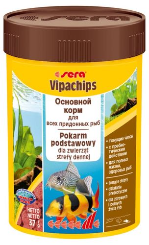 sera Vipachips to pokarm podstawowy w postaci starannie wyprodukowanych chipsów dla wszystkich ryb żerujących przy dnie. Starannie dobrane składniki o działaniu prebiotycznym poprawiają zdrowie i żywotność. Szybko tonące chipsy miękną w wodzie, jednak długo zachowują swój kształt. Dzięki temu pozwalają na powolne żerowanie bez zanieczyszczania wody. Taka forma pokarmu odpowiada nawykom żywieniowym często płochliwych i nocnych ryb przydennych, wspiera także ich rozwój i żywotność.