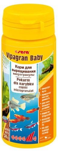 sera Vipagran Baby to pokarm wspierający wzrost w postaci starannie wyprodukowanego miękkiego mikrogranulatu dla wszystkich młodych ryb żerujących w toni wodnej. Zbilansowana, łatwostrawna kompozycja białek pochodzących od zwierząt wodnych, kwasów tłuszczowych omega, alg bogatych w karotenoidy, pierwiastków śladowych jak również prebiotycznych mannanooligosacharydów wspiera zdrowy wzrost, silną odporność na choroby oraz optymalny rozwój i wybarwianie. Tonący drobny granulat pozostaje stabilny przez długi czas i nie traci swojego kształtu, dzięki czemu nie zanieczyszcza wody.