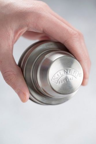 Niestandardowy shaker do drinków i koktajli firmy Kilner. Składa się ze słoika o pojemności 1 l i dwuczęściowej zakrętki. Jedna jest miarką barmańską o poj. 25 ml i 50 ml, a druga pełni rolę sitka. Na przedniej ściance znajduje się tłoczone logo producenta i miejsce na naklejenie etykietki.