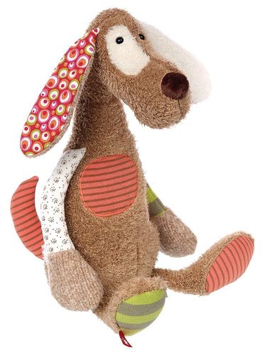 Uroczy pies niemieckiej marki sigikid jest przeznaczony dla dzieci już od pierwszych chwil życia. Idealny do tulenia, uspokajania, usypiania, czytania czy zabierania na spacery. Jest mięciutki i śliczny. Uszyty z wielu kolorowych skrawków materiałów o różnych fakturach i wzorach, perfekcyjnie wykończony i całkowicie bezpieczny dla dziecka. Ma długie uszy, brązowe futerko z białą plamką wokół oka, puchaty nos, długie łapy i zabawny pasiasty ogon.