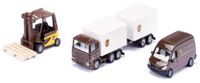 Zestaw składa się z wózka widłowego, 3-osiowego ciągnika samochodowego i transportera w typowej dla UPS kolorystyce.