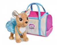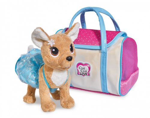 Pluszowy piesek Chihuahua ze świecącą torebką w uroczej zimowej sukience.