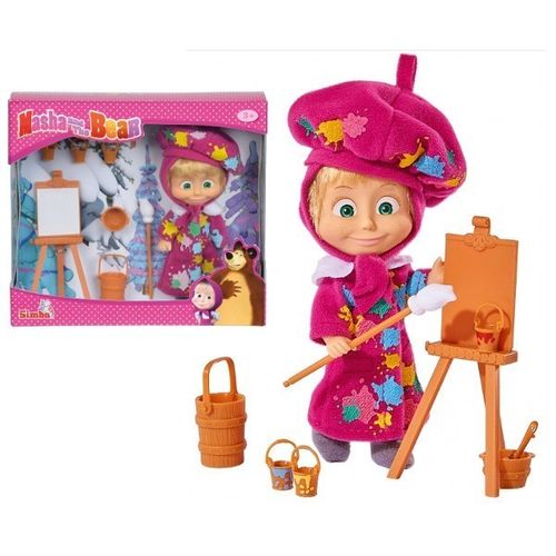 Słodka, mała Masza w stroju malarza z plamkami farby. W skład zestawu wchodzą sztaluga, wiaderka z farbą i akcesoria. Zestaw dodatkowo wyposażony jest w podkładkę z 15 arkuszami białego papieru, które mogą być umieszczone na sztaludze. Masza mierzy 12 cm wysokości i jest przeznaczona dla dzieci w wieku od 3 lat.Wiekod 3 latWymiaryop. 6x18x16,2 cm
