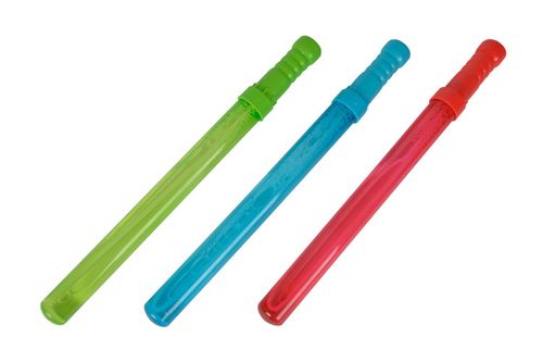W zestawie miecz do baniek, 3 sztuki w różnych kolorach (niebieski, czerwony i zielony).