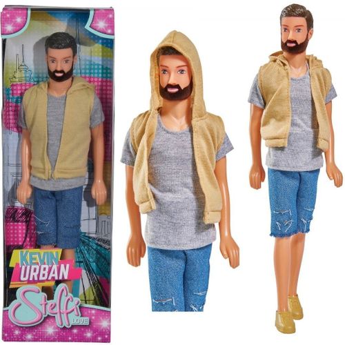 Miejski Kevin Hipster z modną brodą jest ubrany w stylu sportowej elegancji. Lalka ma wysokość 29 cm i ubrany jest w szary t-shirt , brązową kamizelkę z kapturem oraz jeansowe spodenki z dziurami. Na nogach ma założone jasnobrązowe buty. Kevin jest typowym miejskim hipsterem i będzie idealnym uzupełnieniem kolekcji Steffi.