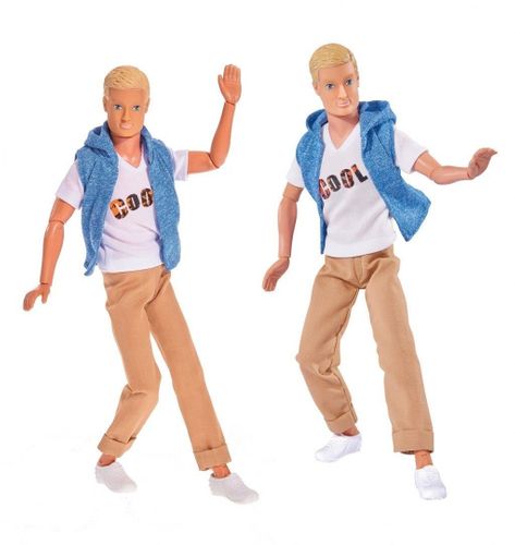 Kevin w modnym ubraniu z serii Steffi Love będzie idealnym partnerem dla twojej lalki. Bohater ubrany jest w najnowsze , bardzo modne ubranie. Ma na sobie szare spodnie w stylu chinosy , biały t-shirt oraz błękitną kamizelkę z kapturem. Uzupełnieniem garderoby są stylowe , białe , modne buty sportowe w stylu classic. Lalka posiada ruchome ręce oraz nogi dzięki czemu zwiększa możliwości zabawy. Wysokość lalki ok 29cm.