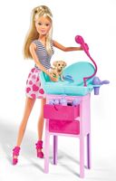 Jeśli uwielbiasz pieski równie mocno, jak Lalka Steffi ten salon psiej piękności został stworzony dla Ciebie. Każdy czworonożny przyjaciel będzie wdzięczny, gdy zapewnisz mu wizytę w tym mini psim SPA. Lalka Steffi opiekująca się zwierzakami w salonie to urocza blondynka ubrana w bluzeczkę w czarno-białe paski i białą w różowe serduszka spódniczkę. Starymi gośćmi salonu są jej dwa jasnobrązowe szczeniaczki. W górnej części szafki zamontowana została wielka wanna, w której wygodnie wykąpiesz swojego pupila, a na koniec możesz opłukać go z nadmiaru piany dołączonym prysznicem. Komoda ma też bardzo pojemne szuflady, w których zmieścisz akcesoria do pielęgnacji, a także przekąskę dla psiaków w postaci smakowitej kości. Zestaw ten zapewni wiele frajdy każdej miłośniczce psiaków.