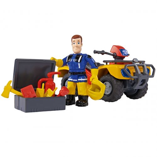 SIMBA Strażak SAM Quad z akcesoriami posiada reflektory w kolorze niebieskim oraz ruchome kółka o oponach wykonanych z gumy, dzięki czemu z łatwością przemieszcza się po powierzchniach płaskich. Został on także wyposażony w specjalną, otwieraną skrzynkę na narzędzia Sama, a dołączona do zestawu figurka Sama może zasiąść za jego kierownicą Figurka Strażaka Sama, ubrana w żółte spodnie, granatową kurtkę, żółty kask, żółte rękawice oraz czarne buty, jest w pełni pozowalna, dzięki ruchomym ramionom i nogom oraz obracającemu się torsowi. Figurka może siedzieć bądź stać, a żółty kask można zdjąć z jej głowy. Dodatkowo w skrzyneczce na narzędzia, będącej częścią pojazdu, znajdują się narzędzia dla Sama - są tutaj między innymi: żółta siekiera, czerwona gaśnica czy dwie żółte krótkofalówki. Wszystkie dołączone narzędzia oraz kask Sam może trzymać w dłoni.