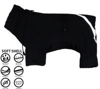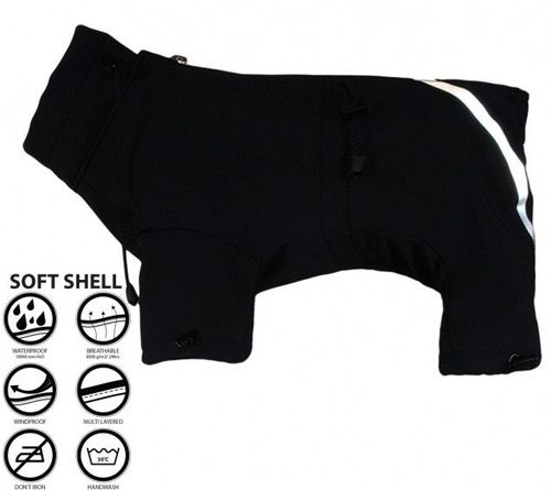 Skafander kombinezon na cztery nogi, umożliwiający swobodne załatwianie potrzeb fizjologicznych. Regulacja sznurkiem z stoperkiem w pasie przy szyi i przy nogawkach, zapięcie to zamek błyskawiczny na plecach. Zastosowany element odblaskowy wpływający na bezpieczeństwo. Kolor czarny. Tkanina soft shell trójwarstwowej, nie przepuszcza wiatru, wodoodporność 10000mmH2O, paroprzepuszczalność 3000 g/m2/24h.