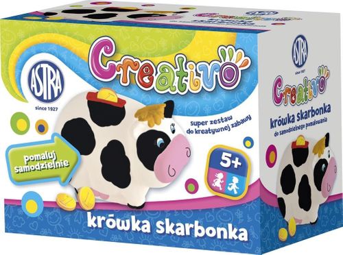 Zestaw Skarbonka malowanka Krówka zawiera: - 6 kolorów farby akrylowej 3 ml - plastikowy pędzelek - gipsowa skarbonka w kształcie Krówki Creativo jest to seria produktów służąca do rozwoju kreatywnego myślenia i zdolności manualnych dzieci. Zestawy Creativo to szereg produktów o różnym stopniu trudności. W serii znajdują się farby do malowania palcami dla najmłodszych, zestawy doniczek do ozdobienia, skarbonki, buteleczki, koło garncarskie i inne.