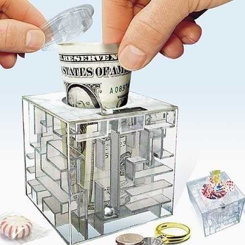 Tak naprawdę jest to rodzaj łamigłówki. Nie dość, że wykonana jest z odpornego plastiku, to będziesz musiał wykazać się prawdziwą zręcznością i niemałą cierpliwością, żeby wydobyć z niej choćby grosz! Zadanie polega na sprytnym manewrowaniu metalową kuleczką w trójwymiarowym labiryncie otaczającym skarbonkę - mechanizm otwierający zadziała tylko wtedy, gdy umieści się kulkę we właściwym miejscu. To naprawdę wciąga!