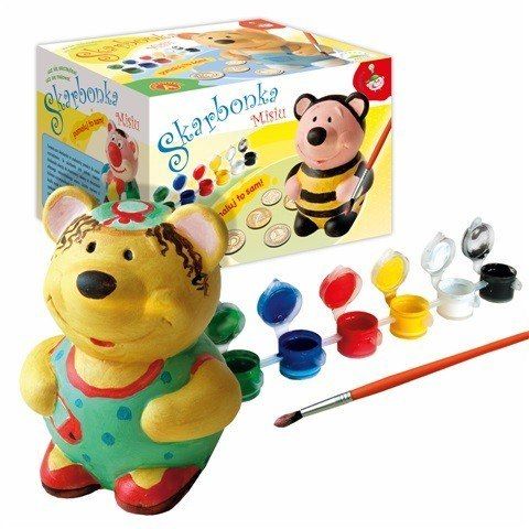 Ceramiczna skarbonka to dobry początek do nauki oszczędzania. Ta skarbonka jest też doskonałą okazją do kreatywnej zabawy w stworzenie własnego, indywidualnego wzoru. Zestaw zawiera 6 kolorów niezmywalnych farbek i pędzelek. Dzięki temu każdy może pomalować swoją skarbonkę według własnej wizji i fantazji. W opakowaniu znajduje się również instrukcja, która zawiera kilkanaście przykładów na pomalowanie - co może być dobrą inspiracją dla każdego twórcy.