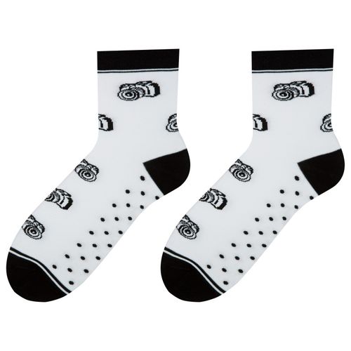 Skarpety w kolorze białym. Skarpety zdobią aparaty fotograficzne w kolorze czarnym oraz kropki. Wykończenia w kolorze czarnym.