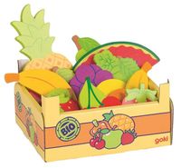 W skrzynceznajdują się między innymi: gruszka, truskawki, jabłko,arbuz, cytryna, pomarańcza, kiść fioletowego winogronu. Łącznie zestaw zawiera 15 sztuk.