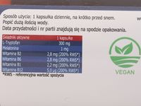 Składnik aktywny 1 kapsułka L-tryptofan 300 mg Melatonina 1 mg Witamina B2 2,8 mg (200% RWS) Witamina B6 2,8 mg (200% RWS) Witamina B1 2,2 mg (200% RWS) Witamina B12 5,0 ug (200% RWS) | | | | | | Stosowanie: | |  | | Sugerowana dawka dzienna 1 kapsułka 1 kapsułka 30 minut przed snem. Popić dużą ilością wody. Nie przekraczać zalecanej porcji dziennej. 1 opakowanie wystarcza na 30 dni Rodzaj kapsułek: Wegetariańskie | | | | | | Opakowanie: | |  | | | 30 kapsułek po 440mg | | | | | |  | | | | | |  | |