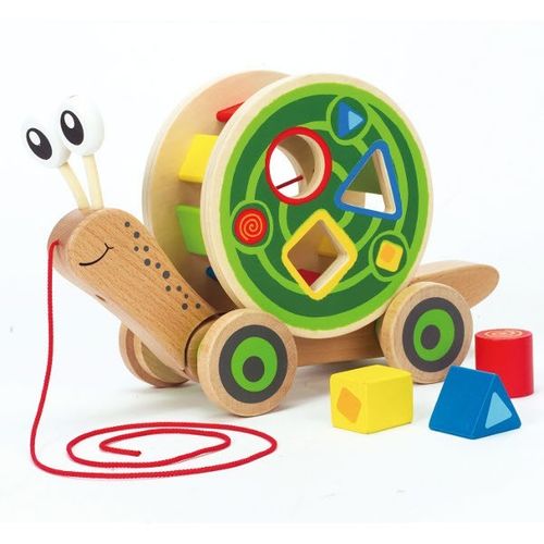 Ślimak na kółkach z muszlą pełną klocków - sześcian, walec, ostrosłup. Kolorowa muszla pełni funkcję sortera dla klocków.