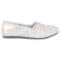 Wykonane z wysokiej jakości naturalnej skóry damskie baleriny. Buty mają kolor jasny, ale na całej ich powierzchni rozmieszczone są różnokolorowe elementy dekoracyjne. Dodatkowo balerinki mają ozdobne grube przeszycia. Niewysoka biała platforma wyposażona jest w gładką podeszwę przygotowaną z syntetyku.