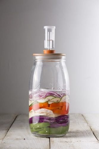 Słoik do kiszenia kapusty, ogórków, buraków i innych warzyw. Wykonany został z wysokiej jakości szkła, a na przedniej ściance znajduje się tłoczone logo marki. Wyposażony jest w drewnianą pokrywkę z elementem odpowietrzającym oraz ceramiczne kamienie. Dzięki elementowi odpowietrzającemu usunięty zostaje nadmiar gazów, a dwa kamienie służą do obciążania zawartości, aby w procesie fermentacji zawartość nie podnosiła się do góry.