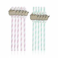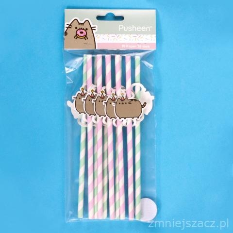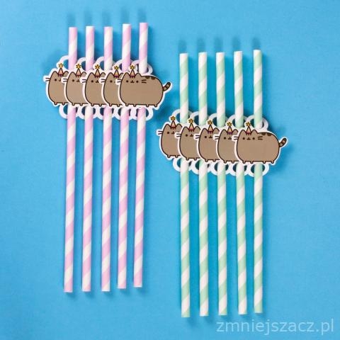Fantastyczne słomki Pusheen. Zestaw 5-ciu słomek fioletowo-białych i 5-ciu zielono-białych z tekturową nakładka przedstawiającą najmodniejszego kota na świecie sprawia, że każdy napój będzie smakował lepiej. Gadżet doskonale pasujący na urodziny czy imprezę okolicznościową, zaskoczy wszystkich gości.