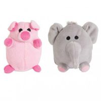 Dwupak pluszowych zabawek przeznaczonych dla małych psów i szczeniąt. Zabawki są wykonane z miękkiego pluszu i zawierają piszczałkę.