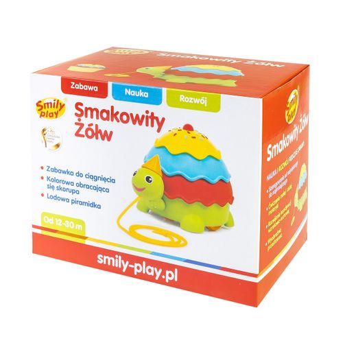 Smakowity Żółw to zabawka do ciągnięcia. Podczas jazdy skorupa żółwia obraca się. Górna część skorupy jest odrębną zabawką w formie lodowej piramidki. Dopasuj kształt i ułóż elementy jeden na drugim.