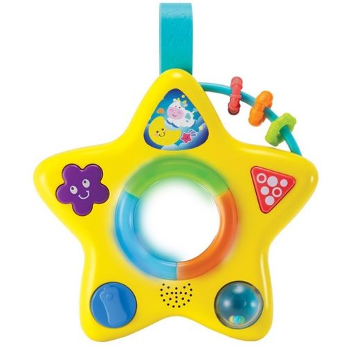 Gwiazdeczka Smily Play to zabawka, która zachęci każdego maluszka do aktywności. Ma ruchome elementy, gra melodyjki i miga światełkami, dzięki czemu rozwija zmysły dziecka. Wyposażona jest w pasek, dzięki któremu zabawkę można przymocować np. do łóżeczka lub wózka.Gwiazdeczka to zabawka aktywizująca. Słuchając wesołych melodyjek, dziecko rozwinie zmysł słuchu. Ruchome i funkcyjne elementy (kółeczka, przyciski i inne elementy) zachęcą do zabawy, która ćwiczy małą motorykę (sprawność dłoni i paluszków).Centralną częścią zabawki jest bezpieczne lusterko. Dziecko będzie się w nim z radością przyglądać, robić miny, które są świetnym ćwiczeniem logopedycznym. Wokół lusterka migają kolorowe światełka.Solidny uchwyt usytuowany na szczycie jednego z ramion pozwala na zaczepienie zabawki przy łóżeczku czy wewnątrz wózka.Co potrafi gwiazdeczka:- Jest grzechotką.- Jest lusterkiem.- Gra wesołe melodyjki.- Wydaje dźwięki.- Radośnie migocące światełka.- Zachęca do zabawy.Wymaga baterii 2 x AA 1,5 V (załączone baterie testowe).Wiekod 3 miesięcyWymiaryop. 22x19,7x6,1 cm