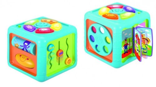 Rewelacyjna zabawka edukacyjna dla Twojego dziecka. Każda ściana kostki zapewnia maluszkowi wiele atrakcji i niespodzianek, absorbując jego uwagę na długi czas. Zabawka stymuluje wszystkie zmysły dziecka oraz wspierając jego rozwój. Błyszczące, żywe kolory, przyjemne dźwięki jak również migające światełka , zachęcają dziecko do zabawy. Kostka edukacyjna to wspaniała zabawa na długi czas.Co zyskuje Twoje dziecko:- Rozwija zmysł wzroku: żywe kolory, migające, kolorowe światełka.- Rozwija zmysł słuchu: różnorodne odgłosy i dźwięki.- Rozwija zmysł dotyku.- Ćwiczy sprawność manualną małych rączek: obrotowe koła, przyciski.- Pobudza wyobraźnię.Kostka edukacyjna jest wspaniałą zabawą, posiada książeczkę z trzema plastikowymi karteczkami do odwracania, na których przedstawione są wesołe historyjki. Przekręcając karteczki maluszek usłyszy wesołe melodie i dźwięki. Kolorowe walce - grzechotki, z sympatyczną buźką morskich zwierzątek i kolorowe kuleczki zainteresują każdego brzdąca. Dziecko uczy się kolorów dzięki obrotowej tarczy. Rozwija małe paluszki przez "tor przeszkód" dla motylka, biedronki i pszczółki. Plansza z pięcioma przyciskami przedstawiającymi zwierzątka, uruchamia melodyjki, dźwięki i światełka. Kostka posiada regulację głośności (dwa stopnie głośności i tryb wyłączenia dźwięku) . Zabawka jest całkowicie bezpieczna dla dziecka, wykonana z najwyższej jakości atestowanych materiałów.Zabawka jest całkowicie bezpieczna dla dziecka, wykonana z najwyższej jakości atestowanych materiałów.Wymaga baterii: 3 x AA 1,5 V (załączone baterie testowe).Wiekod 6 miesięcyWymiaryop. 18,3x19,5x19,3 cm