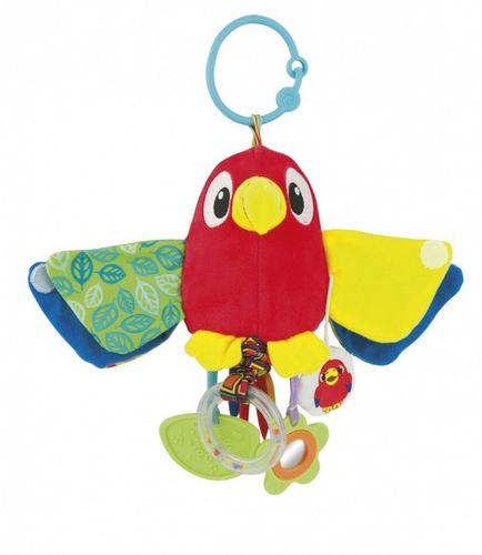 Seria zabawek "Mali Kumple" dedykowana już od urodzenia. Dzięki swej wyjątkowej budowie i mnogości wzorów oddziałowują na dzieci wielozmysłowo. Każda zabawka przypomina inne pluszowe zwierzątko. Poznaj je wszystkie i niech zostaną twoimi najlepszymi kumplami.Papuga:- Grzechocze.- Piszczy.- Ma gryzak i lusterko.- Wibruje.- Zawieś ją nad fotelikiem samochodowym, wózkiem, matą lub przyczep do torby.- Bogate i różnorodne tekstury materiałów.Wesoła Papuga wykonano jest z bardzo przyjemnych w dotyku materiałów. Posiada duży uchwyt, służący do zwieszenia Kumpla. Dziecko, potrząsając nią usłyszy delikatny odgłos grzechotki. Pociągając za kółeczko znajdujące się u dołu papugi, zabawka zacznie delikatnie wibrować. Zawieszka ma gryzak, lusterko oraz przycisk po wciśnięciu którego zabawka zapiszczy.Wiekod 0 miesięcyWymiaryop. 43x26x9 cm