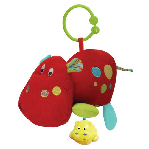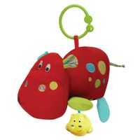Kolorowy, grzechoczący Hipcio – zawieszka. Przypomina zwierzątko i skupia uwagę dziecka. Wykonany z doskonałych materiałów dzięki czemu jest mięciutki, kolorowy i bardzo przyjemny w dotyku. Posiada duży uchwyt mocujący służący do zwieszenia zabawki. Dziecko, potrząsając zabawką, usłyszy delikatny odgłos dzwoneczka. Dodatkowo hipcio ma szeleszczące i ruchome elementy. Przyczepiony do brzuszka plastikowy Hipcio po pociągnięciu wprawia zabawkę w wibracje. Doskonale stymuluje małą motorykę dziecka.