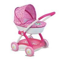 Wózek dla lalek wykonano różowej połyskującej kolorystyce . Stabilny pojazd, dzięki dużym kołom zapewni pełen komfort i bezpieczeństwo zabawy. Posiada budkę oraz pokrowiec z wizerunkiem uwielbianymi przez maluchy Księżniczkami. Posiada koszyczek na wszystkie akcesoria potrzebne małej mamie.